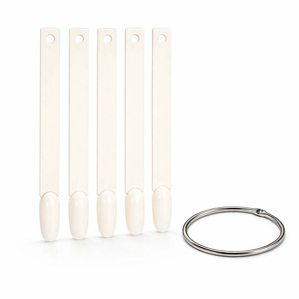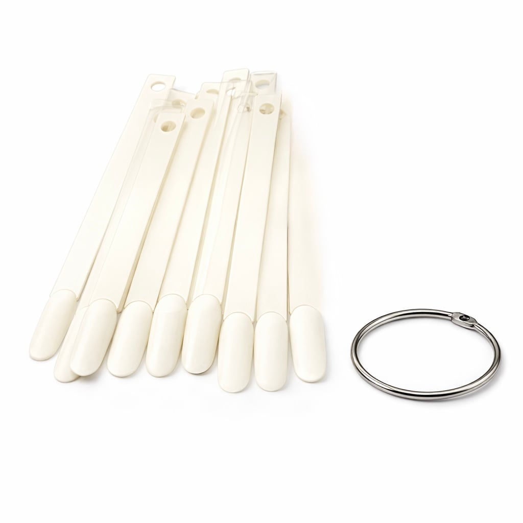 Το σετ αποτελείται από 45 oval tips, ενωμένα με μεταλλικό Ring, ώστε να παραμένουν όλα μαζί και εύκολα στη χρήση. Παραδίδονται σε σακουλάκι, έτοιμα για άμεση τοποθέτηση χρωμάτων.