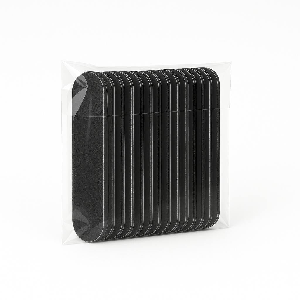 Η επαγγελματική ξύλινη λίμα νυχιών σε μαύρη απόχρωση συνδυάζει την κομψότητα με τη λειτουργικότητα. Με βάρος μόλις 0.5G ανά τεμάχιο και συμπαγείς διαστάσεις 5cm x 1.3cm, προσφέρει άνετο χειρισμό και επαγγελματικό αποτέλεσμα. Η οικονομική συσκευασία των 20 τεμαχίων είναι ιδανική για επαγγελματική χρήση.